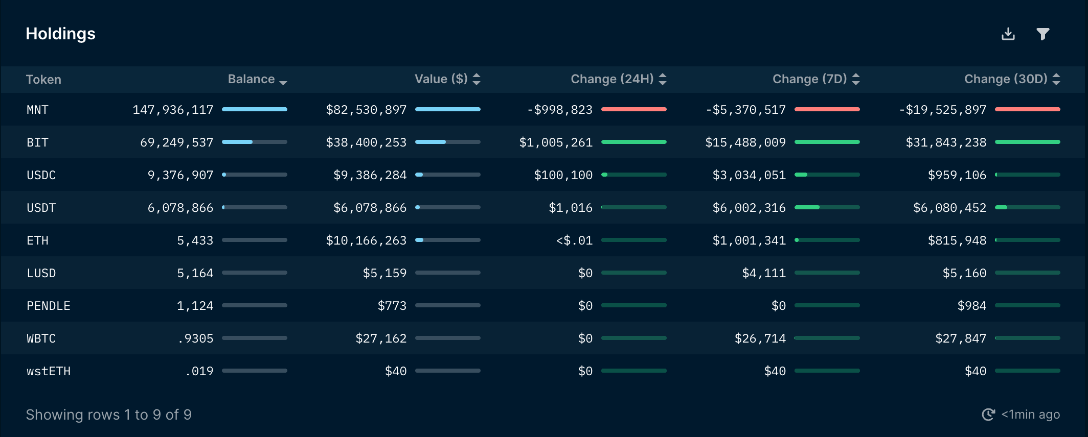 - The largest token holding is MNT with a balance of 147m MNT (~$82m), followed by BIT, USDC, USDT, ETH, LUSD, PENDLE, UWBTC, and wstETH.