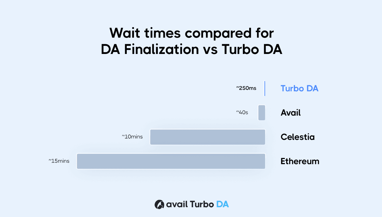Turbo DA is a major upgrade that allows rollups to post their data with pre-confirmations in less than 250 milliseconds. In other words, this empowers extremely fast applications that aren't otherwise possible on other DA layers. For context, these are the waiting times for other DA layers (these are not block times).