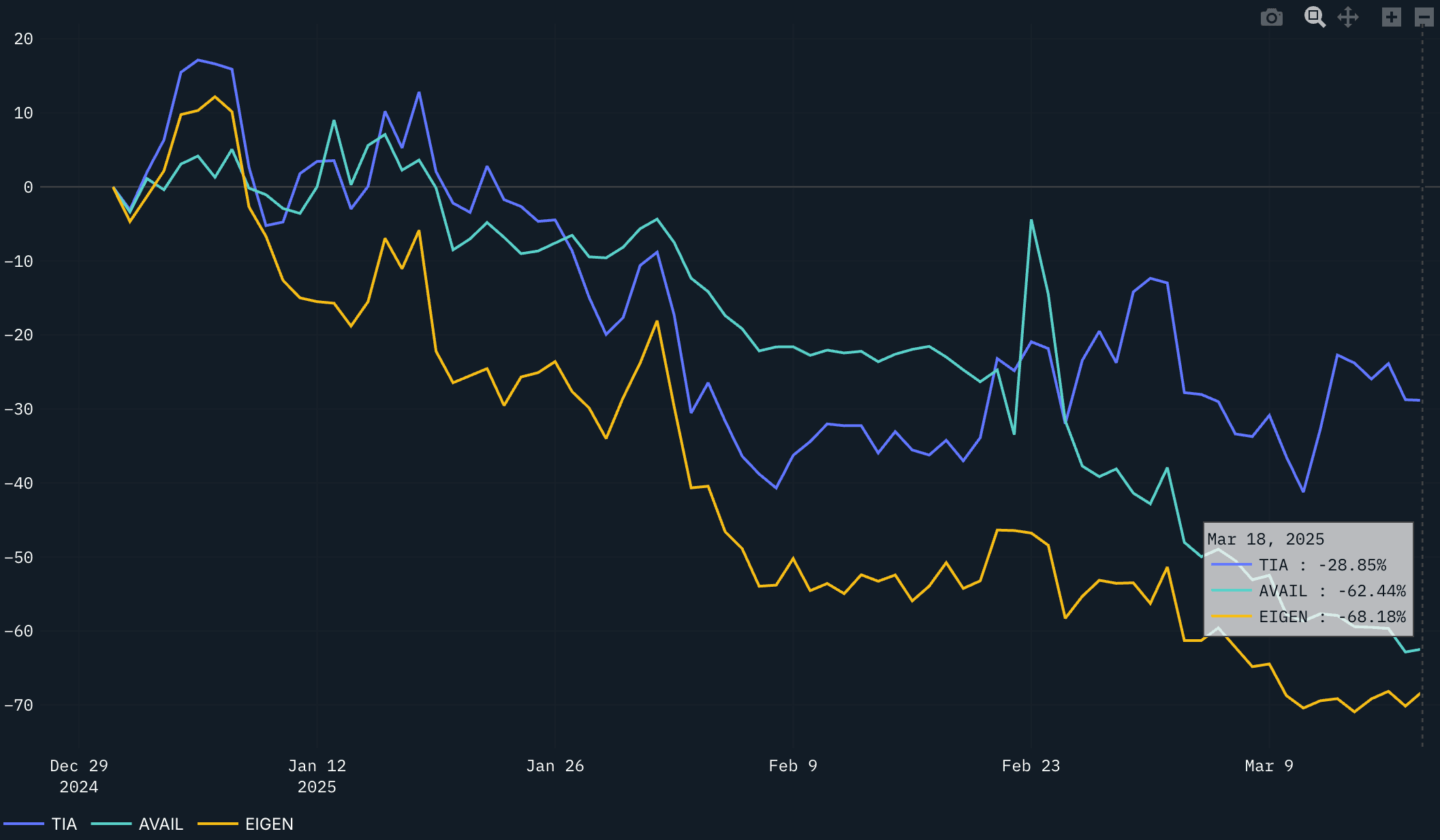 YTD, the DA sector has taken quite the hit with the likes of EIGEN being down 68%, AVAIL at 62% and TIA over 28%. TIA has held up the strongest of the group as measured by its limited downside. At the time of writing, the FDVs of the projects are as follows: