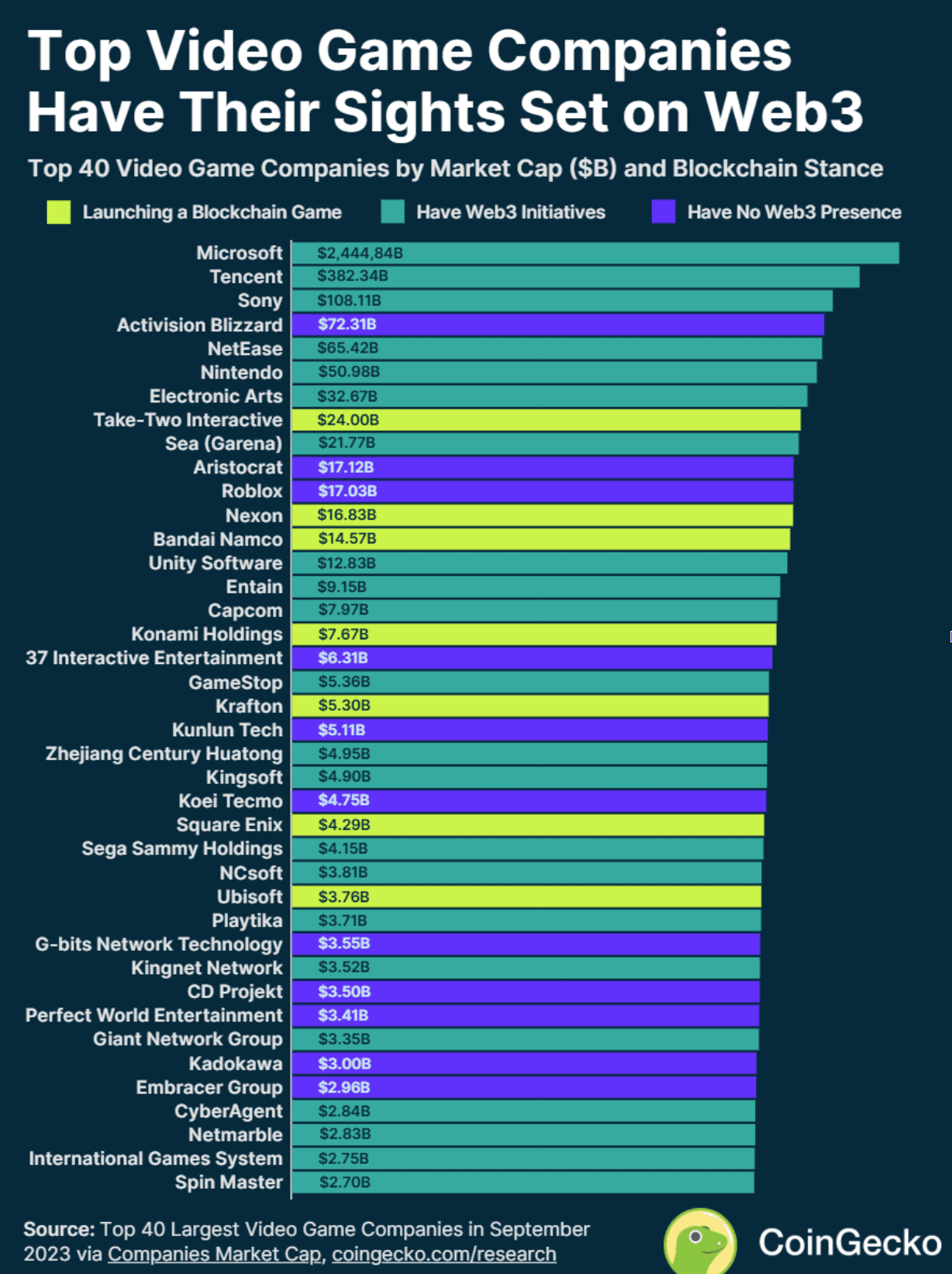 According to a 2023 report by Coingecko, 29 of the world's 40 largest gaming companies are actively exploring Web3 technologies. Of these, seven are developing Web3 games in-house, while others are investing in blockchain gaming projects or hiring for blockchain-related roles.