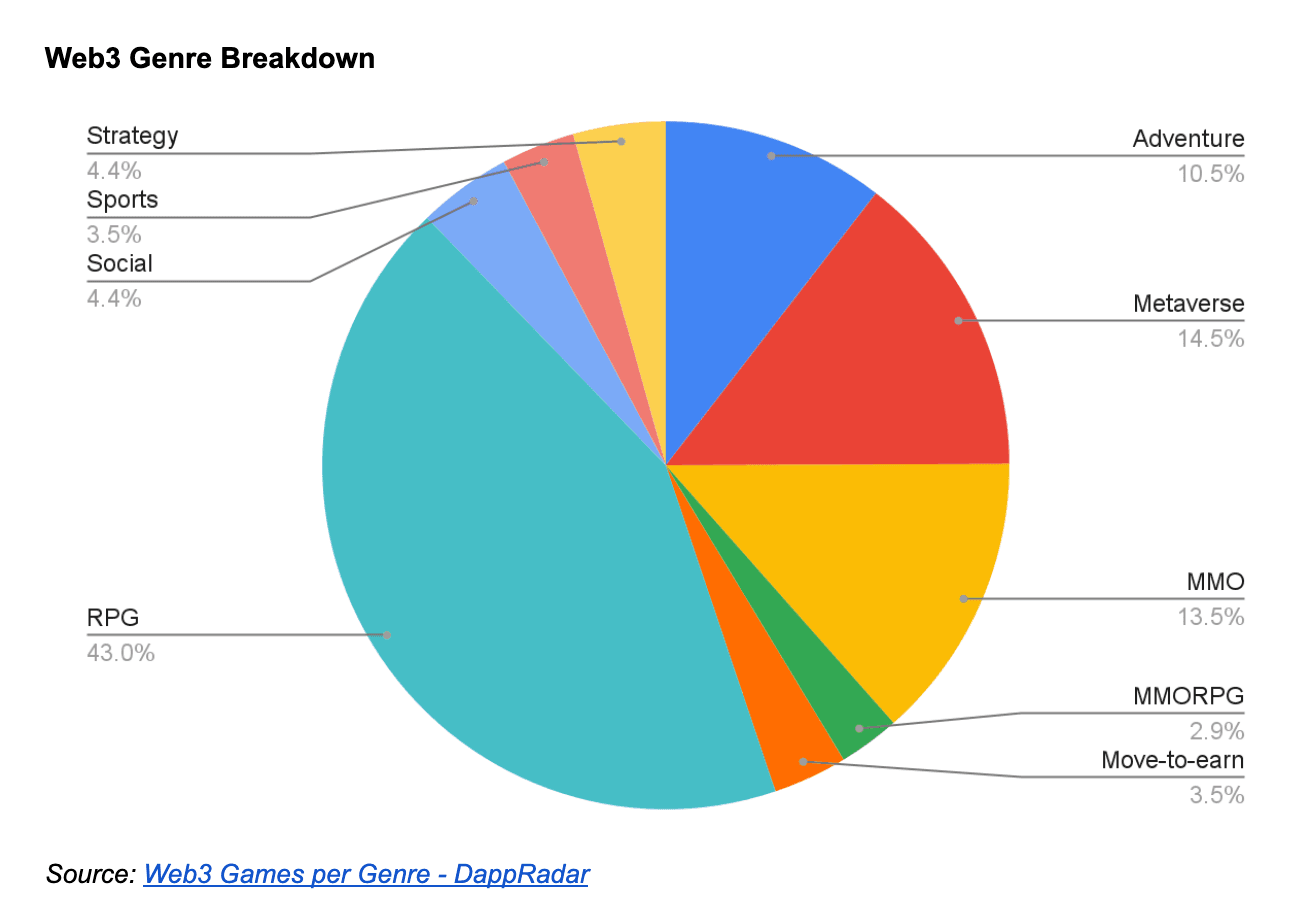 As Web3 gaming matures, engagement has grown across a diverse range of genres, with RPGs emerging as a leading category due to their immersive narratives and in-game economies. A 2023 report by Game7 shows that RPGs account for 22% of all gaming activity in the Web3 ecosystem.