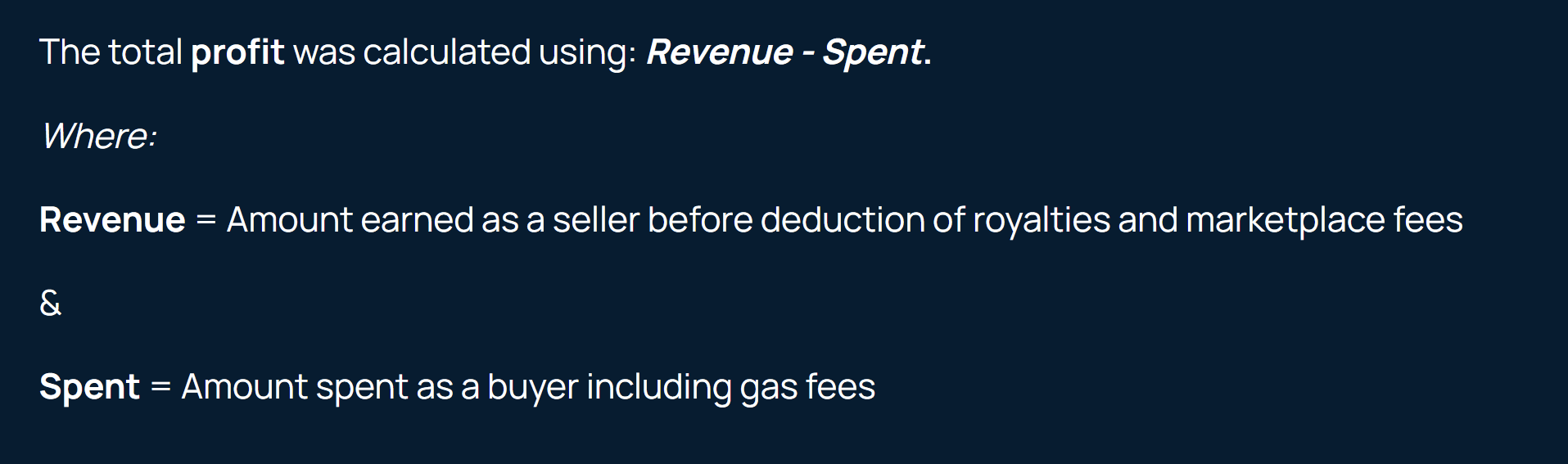 The profit leaderboard given above shows the top profitable wallets that have at least 10 sales across at least 3 collections within the virtual real estate sector (as covered in this analysis). This was done in order to identify wallet addresses that were active in the space and have been consistently outperforming, rather than highlighting wallet addresses with one or two lucky (or insider) trades.