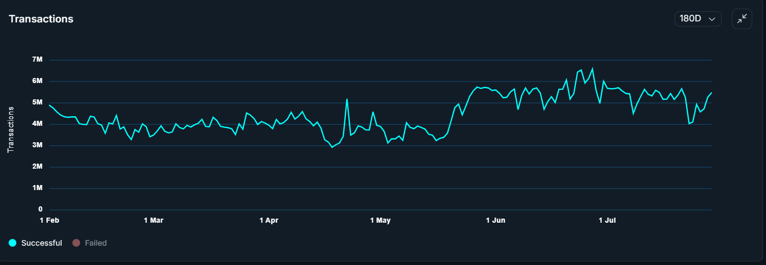 Throughout H1 2025, Aptos maintained a stable level of daily transaction activity, consistently supporting a healthy baseline of on-chain throughput. This steady performance reflects the network’s operational maturity and reliability as it expands into regulated finance, institutional partnerships, and real-world use cases. With growing attention from public sector initiatives and an expanding developer ecosystem building on Move, Aptos demonstrated its ability to handle consistent user and application-level demand without fluctuation. The sustained throughput serves as a foundation for broader adoption across DeFi, enterprise, and consumer-facing applications.