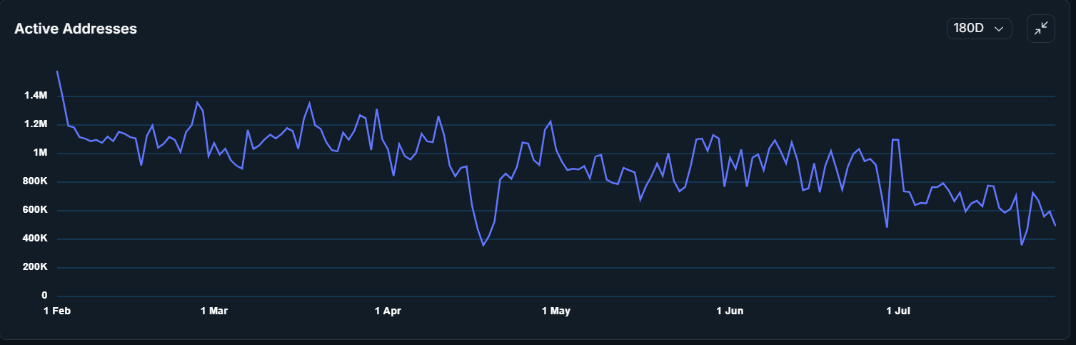 Daily active addresses on Aptos remained consistently strong throughout H1 2025, with sustained user counts exceeding 1 million during key periods and peaking above 1.4 million in early February. The network maintained a resilient floor of 600,000+ active addresses per day, reflecting durable user engagement across multiple verticals. This steady performance was supported by the launch of new protocols such as Amnis Finance, Kana Labs, and Thala, which collectively expanded DeFi utility and liquidity options on Aptos. Continued investment in infrastructure by projects like Pyth Network and Switchboard also contributed to reliable developer tooling and data availability.