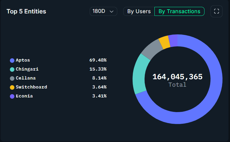 Transaction-level data highlights consistent usage across diverse sectors within the Aptos ecosystem. While Aptos itself generated the majority of activity at 69.48%, several key applications played significant roles in sustaining on-chain engagement. Chingari accounted for 15.33% of all transactions, driven by its social engagement features, while Cellana, and Switchboard, collectively contributed around 12% of all transactions on Aptos. This distribution reflects a vibrant and expanding set of applications that are actively contributing to the network’s throughput and utility. As more projects mature and scale on Aptos, these contributions reinforce the chain’s position as a performant, application-driven Layer 1.