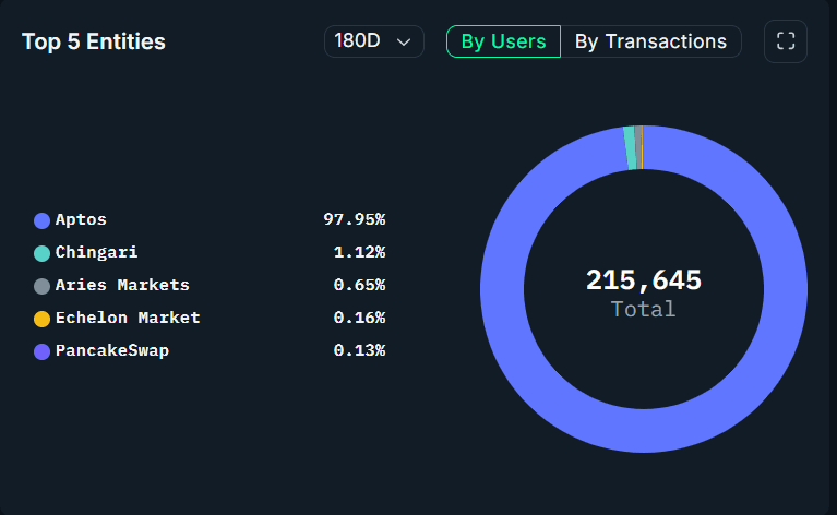 During H1 2025, the Aptos ecosystem showcased strong application-layer engagement, with usage patterns reflected across both user and transaction-level metrics. Aptos itself accounted for 97.95% of all unique users interacting on-chain over the six-month period, underscoring high levels of native protocol activity, particularly from core wallets and network infrastructure. This dominance was complemented by growing participation from key applications like social platform Chingari (1.12%) and DeFi protocols such as Aries Markets, Echelon Market, and PancakeSwap, which collectively made up a small but rising portion of the user base. These figures indicate ongoing efforts to diversify network usage beyond native functions while maintaining strong baseline engagement.