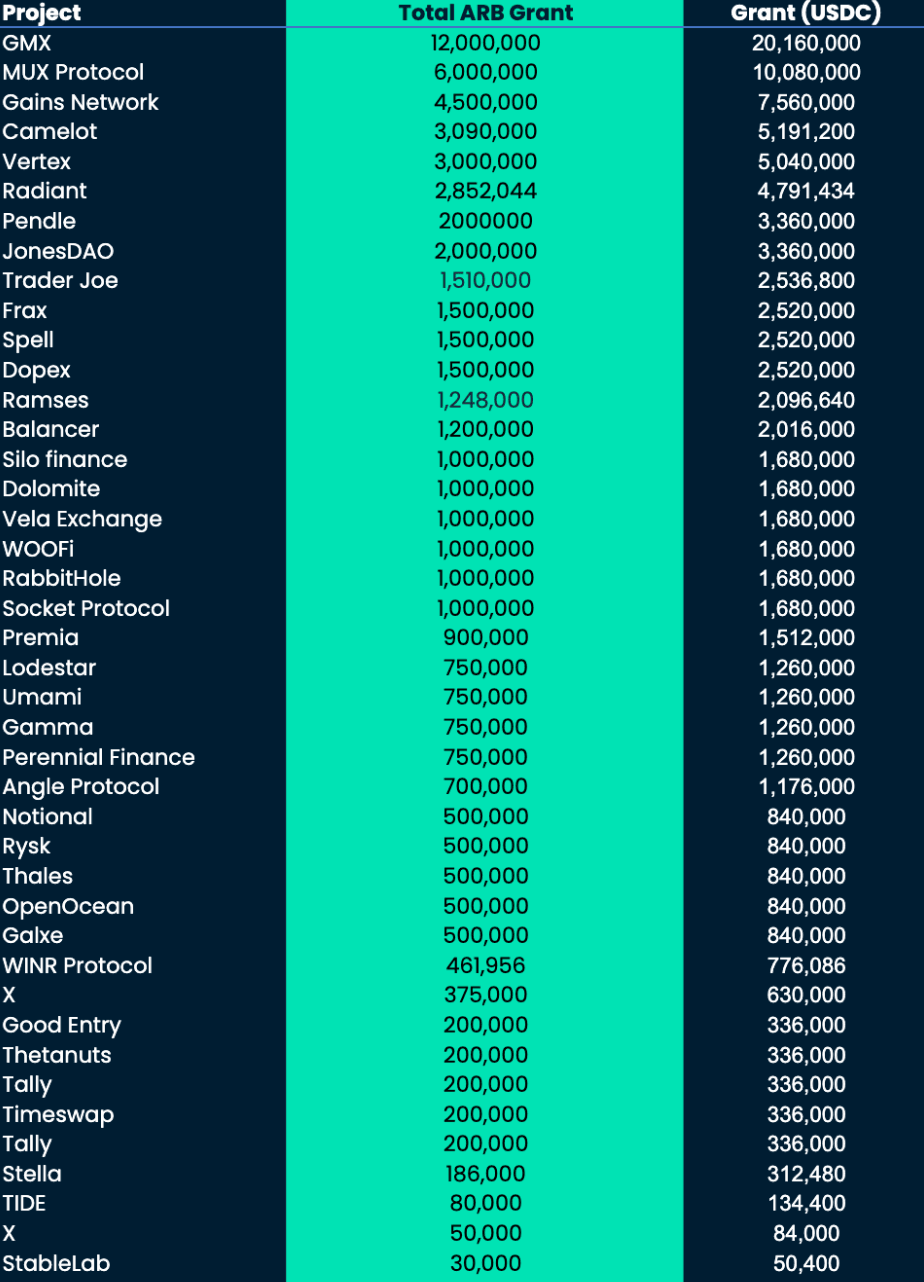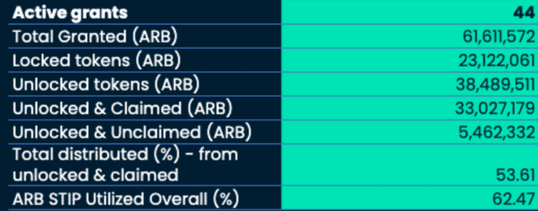 A total of 44 active grants were accepted, with a total grant amount of 61.6M ARB (~$103M). Over 62.5% of the STIP has been distributed (not fully claimed), while 53% of the total amount has been distributed and claimed by protocols.