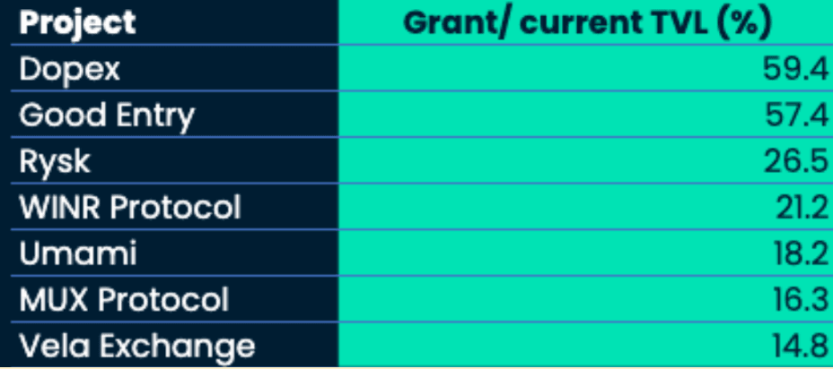 When we look at tokens with a high grant / current TVL ratio, signaling that the grant size can significantly impact the protocol positively, Dopex stands out at 60% of grant / TVL, followed by Good Entry, Rysk, Wynr, Umami, and MUX Protocol.