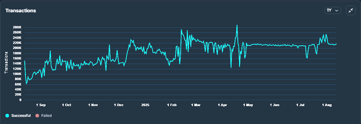 Throughout H1 2025, Bitlayer demonstrated consistent and robust transaction activity, underscoring its emergence as a performant and reliable Bitcoin Layer 2 network. Transaction volume remained elevated across the six-month period, with daily throughput consistently ranging between 160,000 and 220,000. Key surges occurred in late January, mid-February, and early April, aligning with major ecosystem developments including the launch of the BitVM Bridge, its integration with Monad testnet, and the progression of BTCFi campaigns. These patterns reflect a healthy correlation between technical advancements and onchain engagement, suggesting growing developer and user confidence in the platform’s infrastructure.