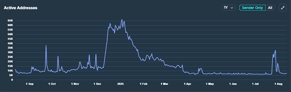 During H1 2025, Bitlayer exhibited a strong and dynamic pattern of user activity, with active address counts reaching a notable peak above 60,000 in January. This surge followed a steady climb that began in December 2024, coinciding with the initial rollout of Bitlayer’s BitVM Bridge and early BTCFi ecosystem campaigns. The spike in unique sender addresses reflects growing interest in BitVM-based infrastructure and a sharp uptick in application-level experimentation driven by new protocol deployments.
