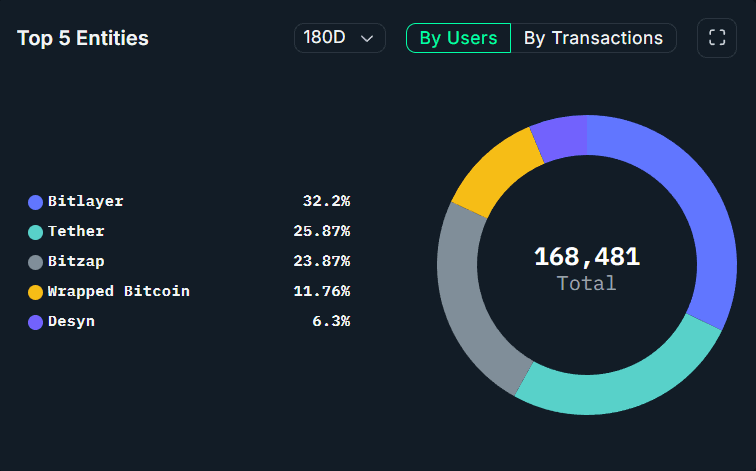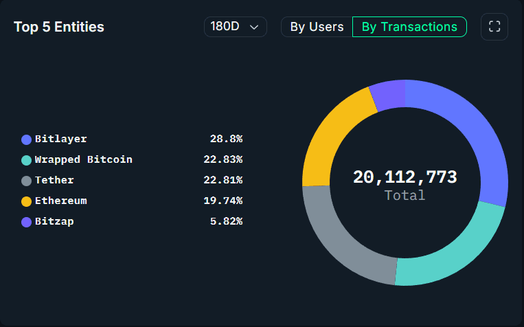 Transaction-level data further validated the growing utility of the Bitlayer network. Bitlayer-originated transactions made up 29.04% of all activity, while Wrapped Bitcoin and Tether posted similarly high shares at 22.8% and 22.72%, respectively. Ethereum bridged assets accounted for 19.65%, highlighting Bitlayer’s expanding interoperability footprint and relevance in multichain asset flows. BitZap contributed 5.79%, reflecting its role as an emerging protocol driving both user engagement and transactional throughput. Together, these figures illustrate a diverse and maturing application layer where both core infrastructure and novel protocols are contributing meaningfully to overall network activity.