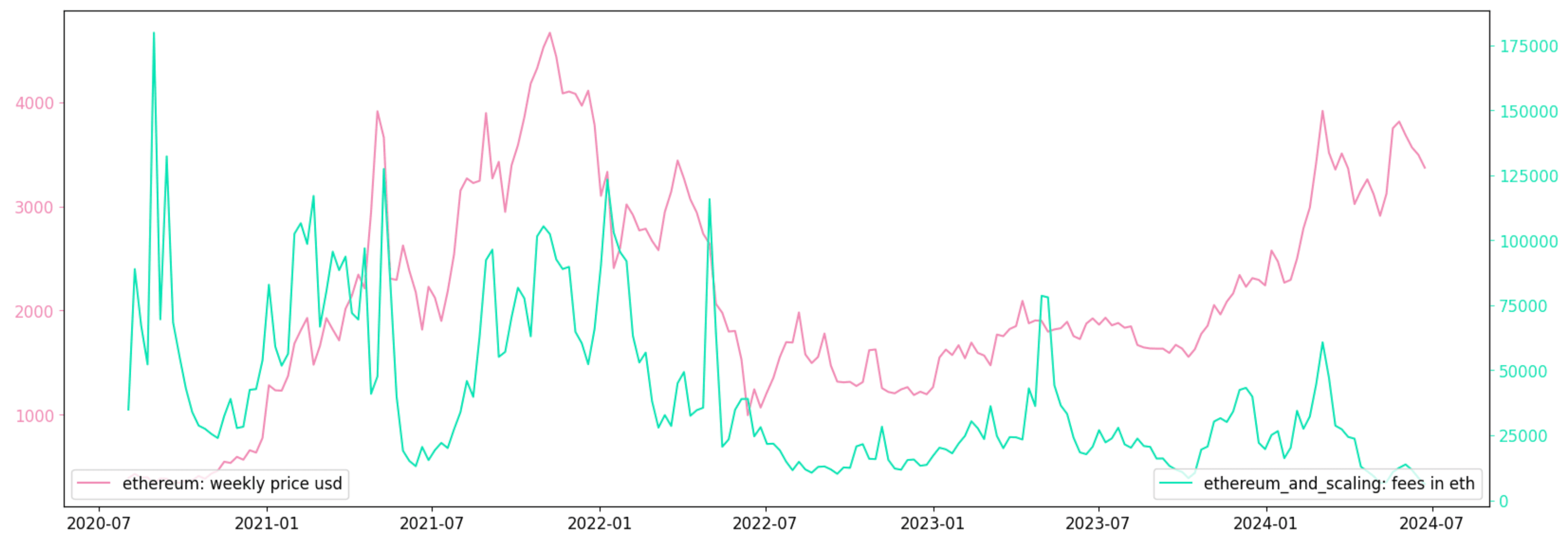 Chart 3: Fees (in ETH) on Ethereum + L2 Ecosystem vs ETH Price