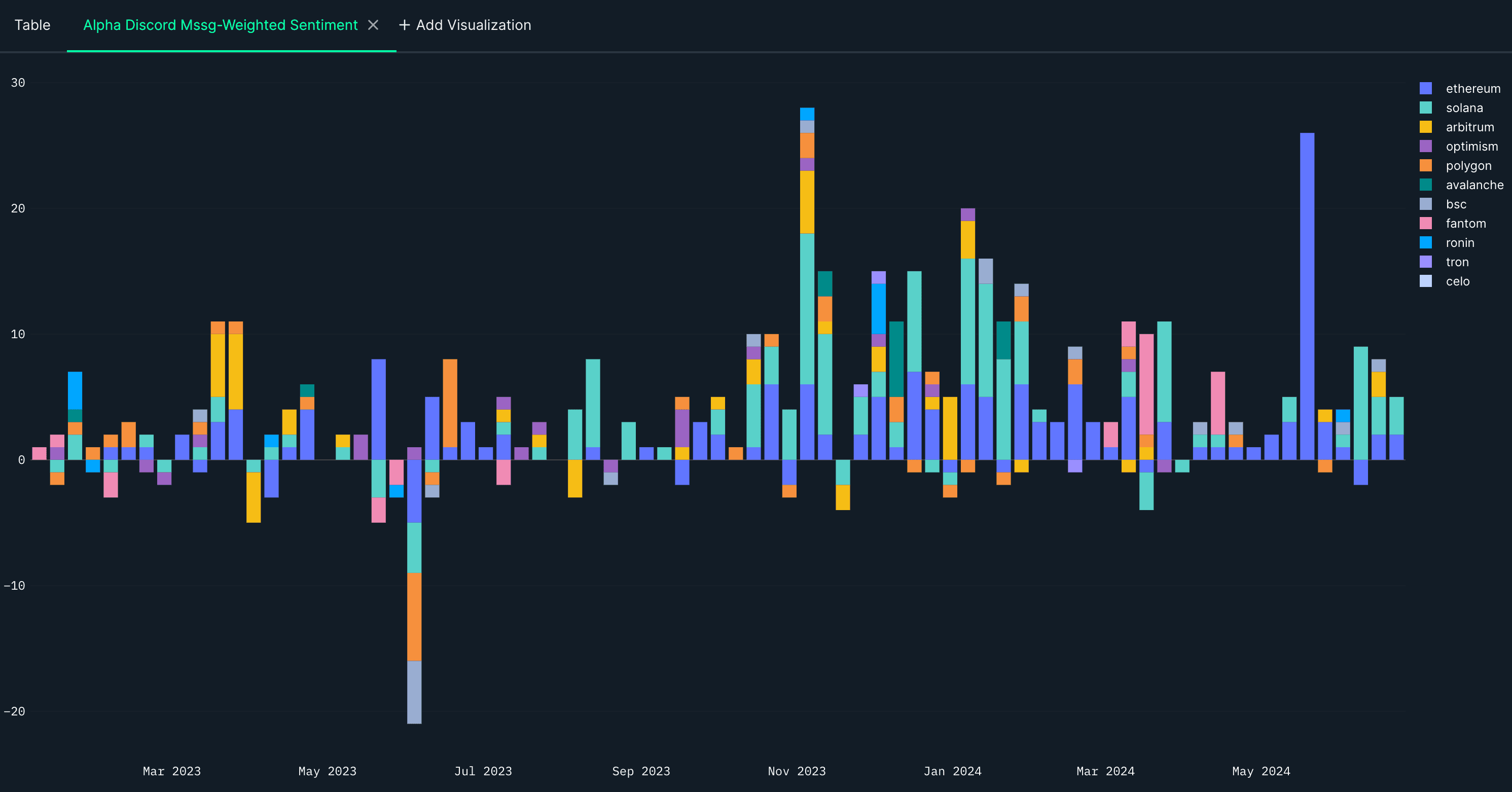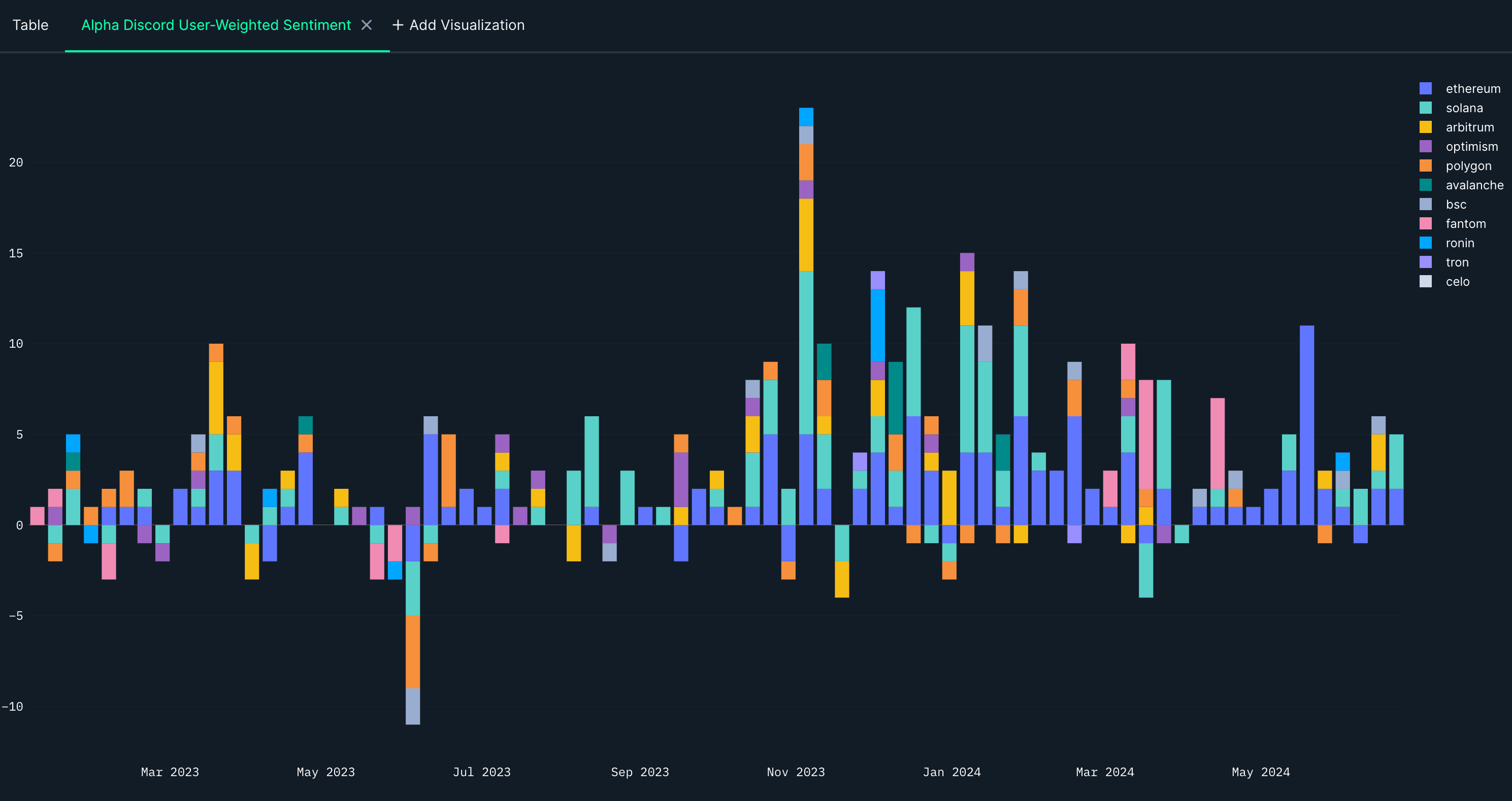 Chart 9: Nansen Alpha Discord User-Weighted Sentiment, per chain, per week
