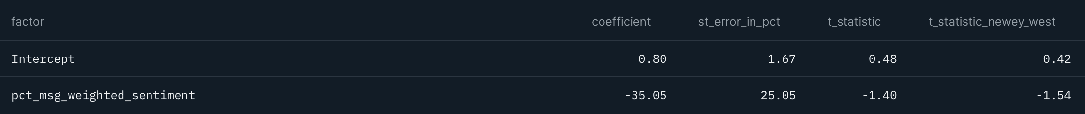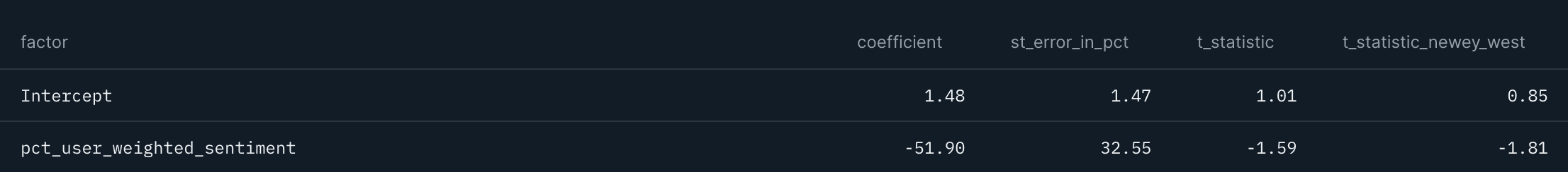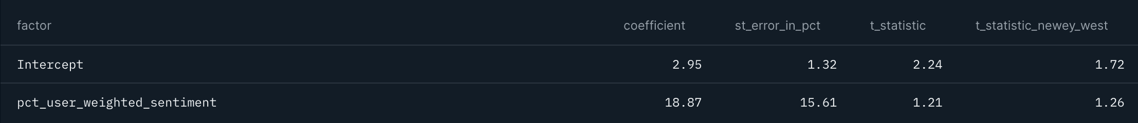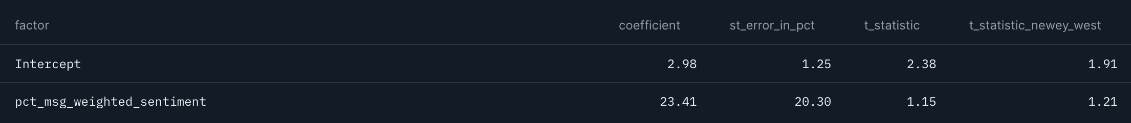 Looking at leading relationships, we cannot find sufficient t-stats (tables 12 and 13). There could be several reasons behind this lack of satisfactory results: we suspect that a higher time granularity than weekly is required when using social sentiment data, as price moves occur very fast.