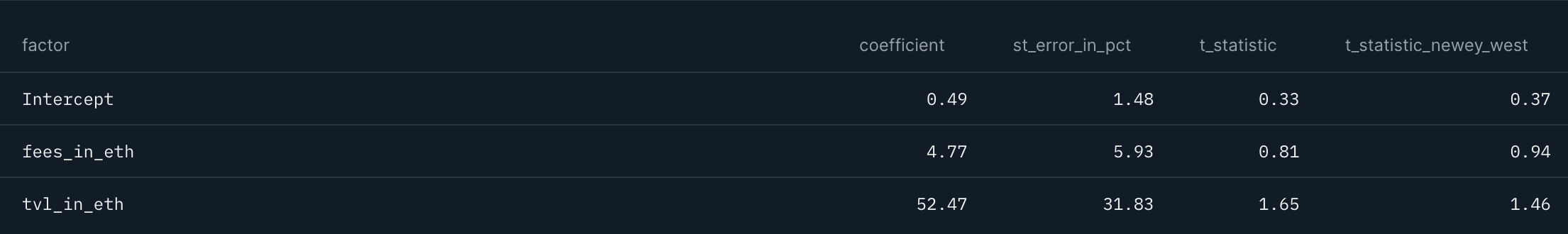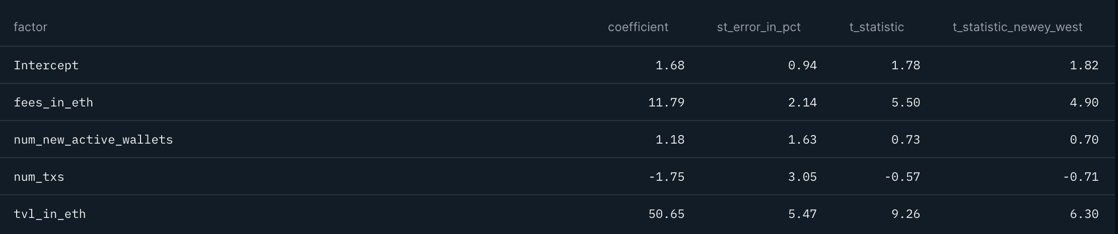 Now for the process: each statistic (number of transactions, number of new wallets, fees in local gas currency/ in ETH, TVL) represents a factor that we want to test as independent variables vs governance token prices as dependent variables. We start by running cross-sectional regressions per week where Token Price Weekly Return(at T) = (Num Tx % Chg Coeff 1 + Num New Wallets % Chg Coeff 2 + Fees % Chg Coeff 3 + TVL % Chg Coeff 4)(at T).