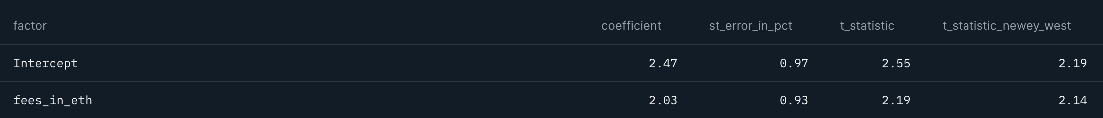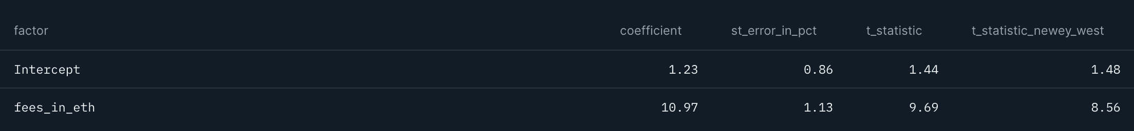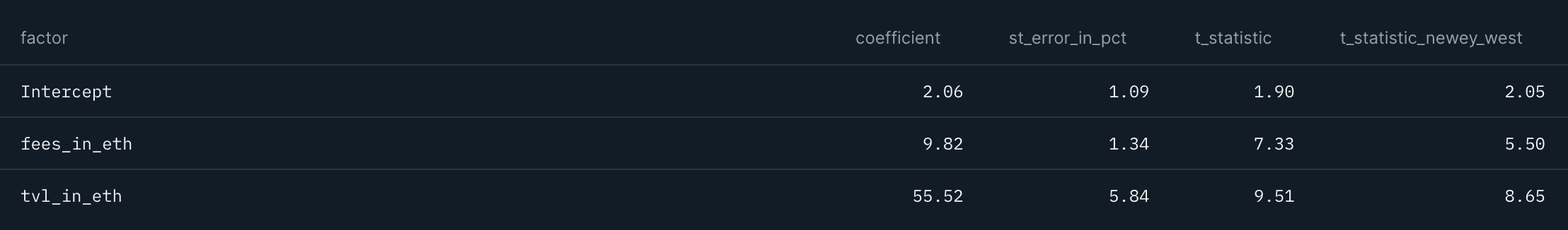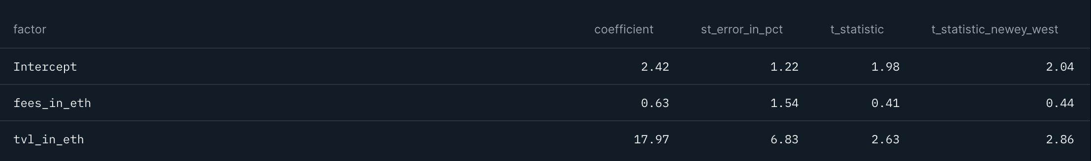 Staying with these two variables, we want to find out whether TVL in ETH and Fees in ETH weekly % changes are predictive of price returns, one week in advance. The results are presented in Table 3. As can be observed, t-stats remain significant for TVL in ETH but not so for Fees in ETH.
