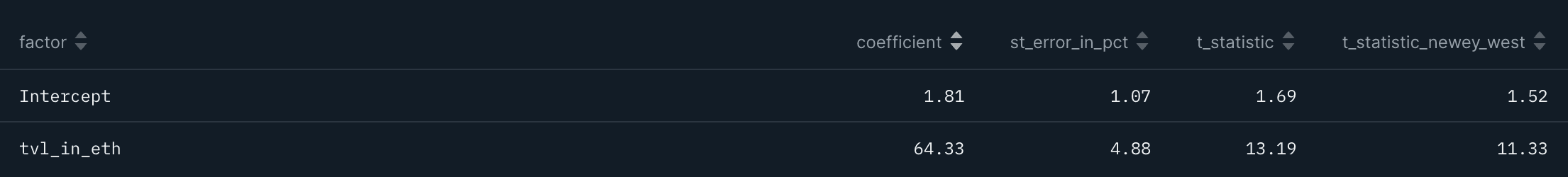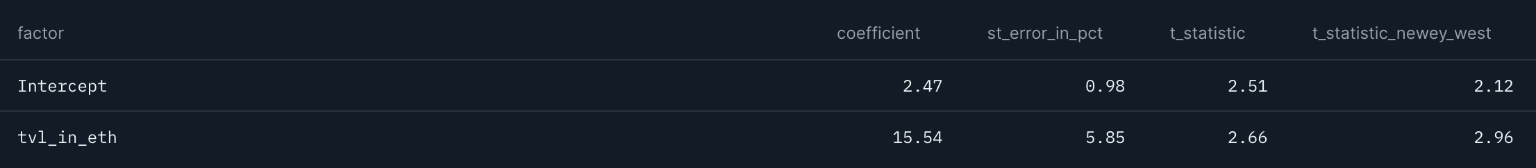 Finally, we stick with Fees in ETH and TVL in ETH but split them apart to run four one-factor models, one contemporary and one leading, per factor.