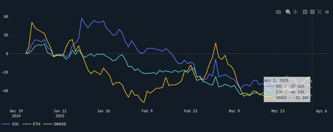 YTD, GRASS has performed well given the broader risk off environment and large drawdowns in the altcoin sector, with the likes of ETH and SOL underperforming vs GRASS.