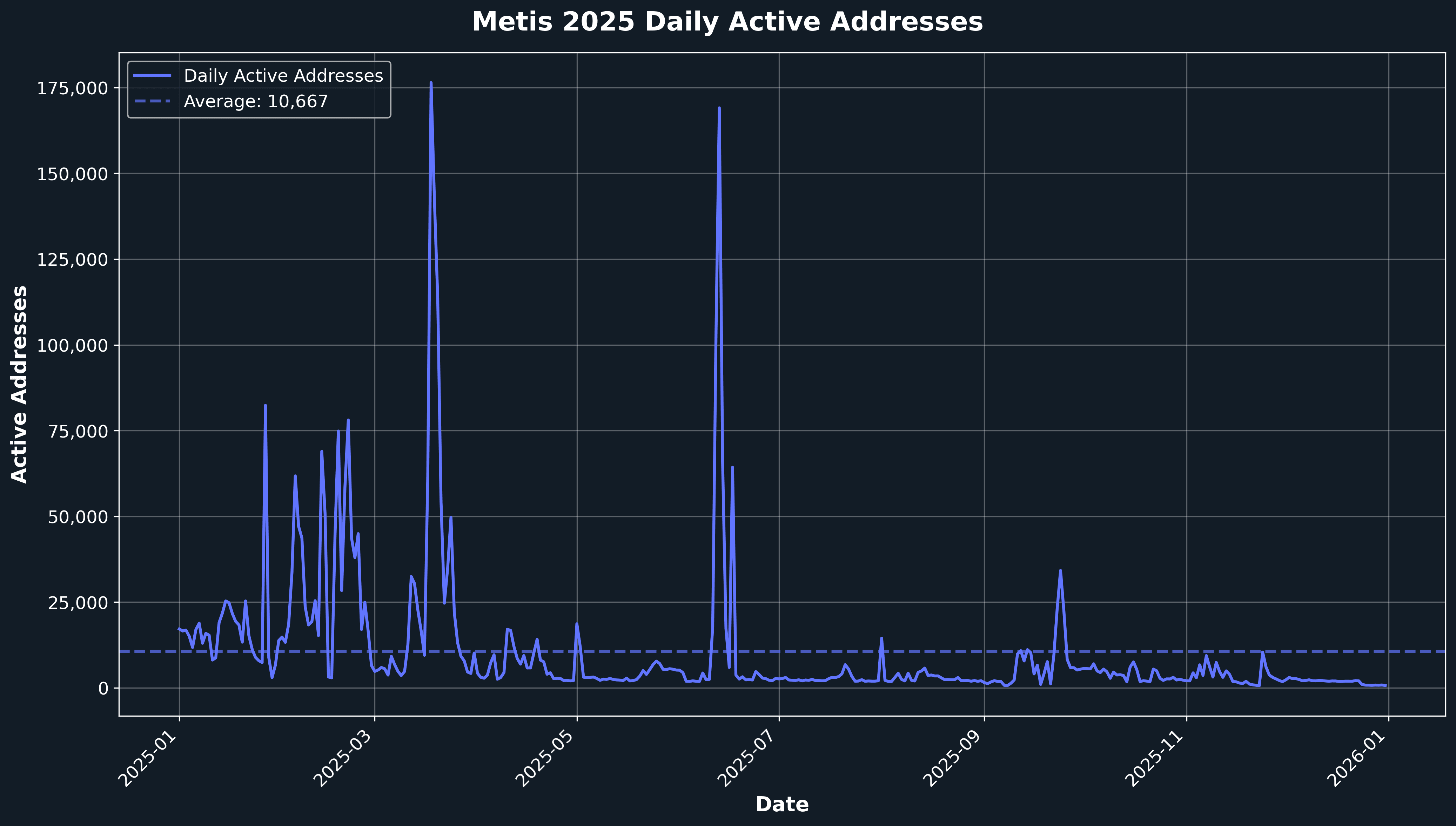 Metis maintained a healthy base of active addresses throughout 2025, averaging 10,667 daily active addresses with peaks reaching 176,442. The year showed periodic surges in user activity, particularly during major ecosystem developments including Hyperion Testnet launches, HyperHack hackathon events, LazPad Open Launch, CreateAI marketplace launches, and DeFi Kingdoms tournament series. These activity spikes demonstrate growing user engagement across diverse use cases, from gaming and entertainment (DeFi Kingdoms) to DeFi protocols (Netswap, Aqualis, Artemis) and AI-native applications (Lazbubu, CreateAI). The consistent user base reflects Metis's expanding appeal across multiple sectors, from traditional DeFi to cutting-edge AI infrastructure, as the network continues to onboard new partnerships and protocols.