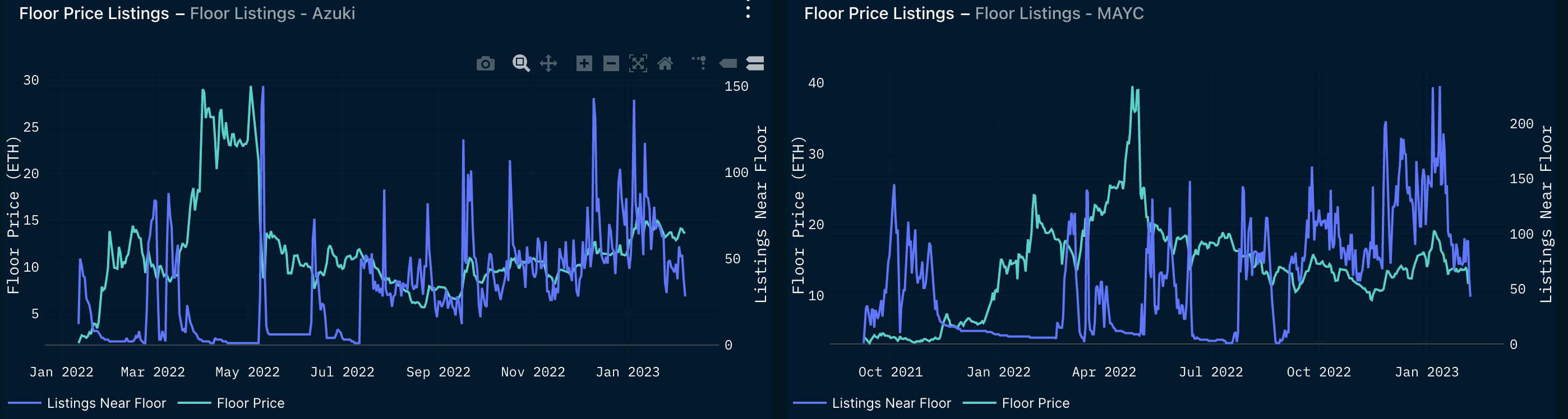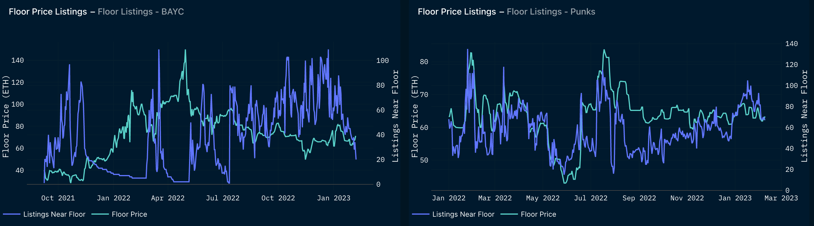 Taking a closer look at the case studies, CryptoPunks again have a slightly different behavior than the rest. The number of listings close to the floor for CryptoPunks seems to almost track floor price movements. This could be due to them being among the oldest NFT collections and also their floor prices not tracking the overall NFT market too closely as discussed previously. Additionally, the listings near the floor never reach an extremely low point and are always above 23.
