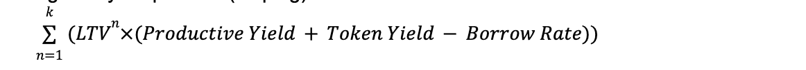LTV refers to the loan-to-value ratio for your lending position, and k represents the number of loops. A recent example of looping yield is borrowing against Ethena's USDE on Morpho, using the borrowed amount to purchase more USDE, and repeating the process. This yield component acts like a multiplier to existing yield and is highly speculative and risky. It is also “optional”, and not all investors will choose to take on the additional risks, especially liquidation risk, but also additional protocol risk or spikes in the borrowing rate.