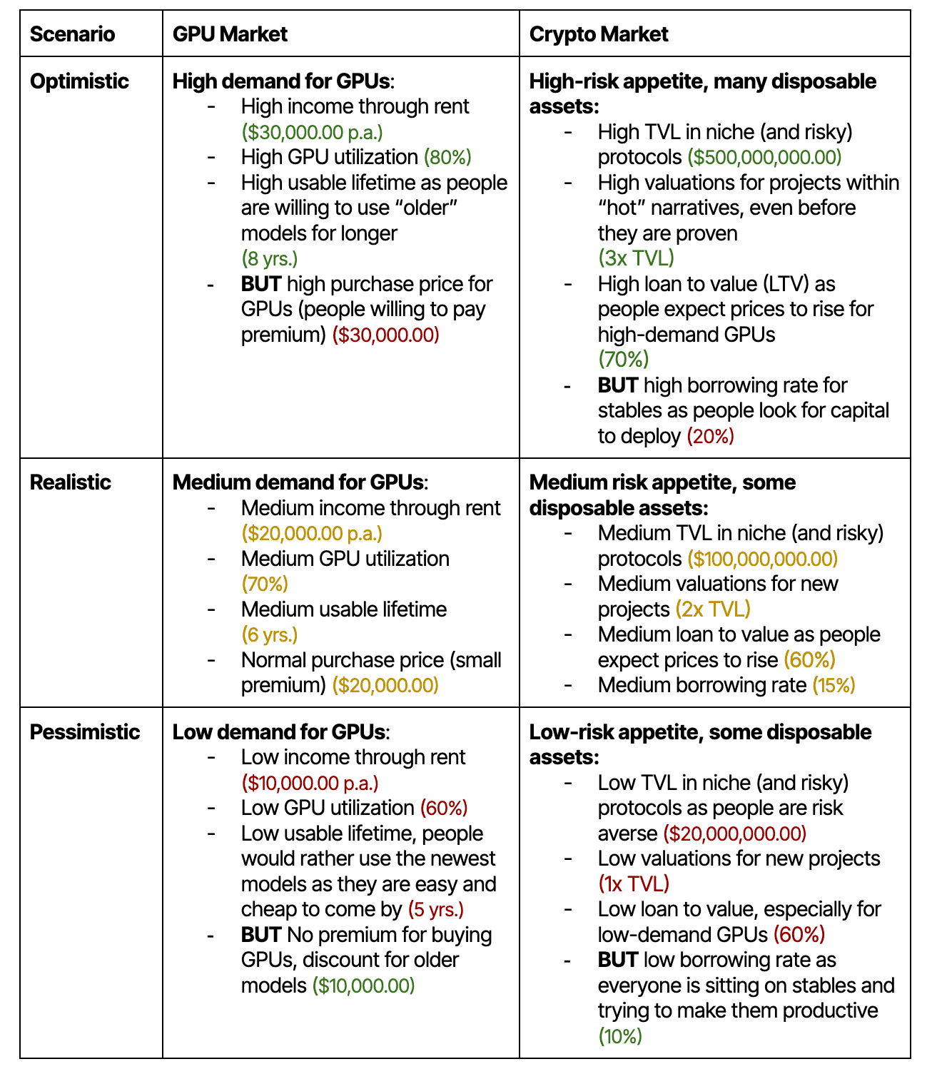 The following table depicts the assumptions for each scenario, based on a H100 GPU. The model protocol studied for this simulation is Metastreet, which is spearheading GPU financial, renting, and yield distribution.