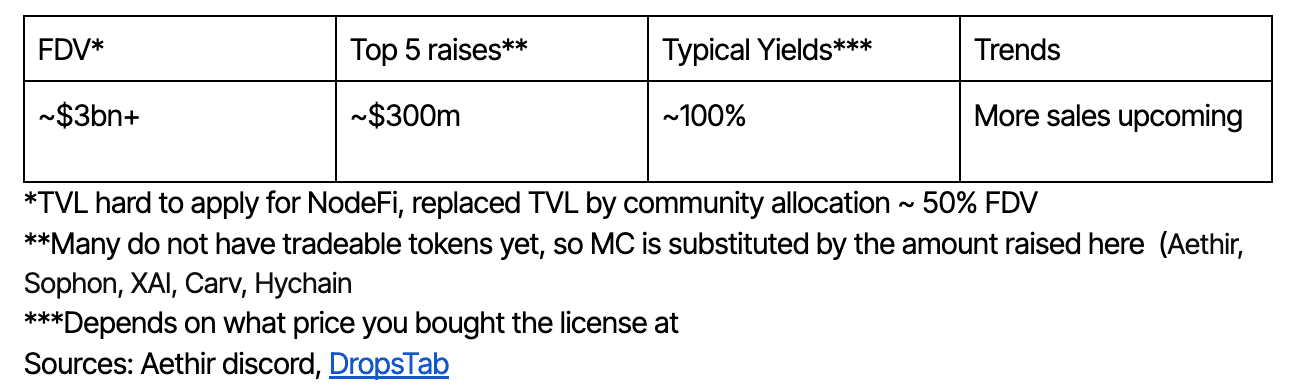NodeFi is a new and emerging narrative and method for raising funds for projects. Licenses to operate blockchain nodes are tokenized (usually as NFTs) and sold, with the (token) rewards for node operators typically being quite substantial. At least for the projects, it seems to be working; the three largest node sales alone (XAI in November 2023, Aethir in March 2024, and Sophon in May 2024) have collectively raised almost $250 million.