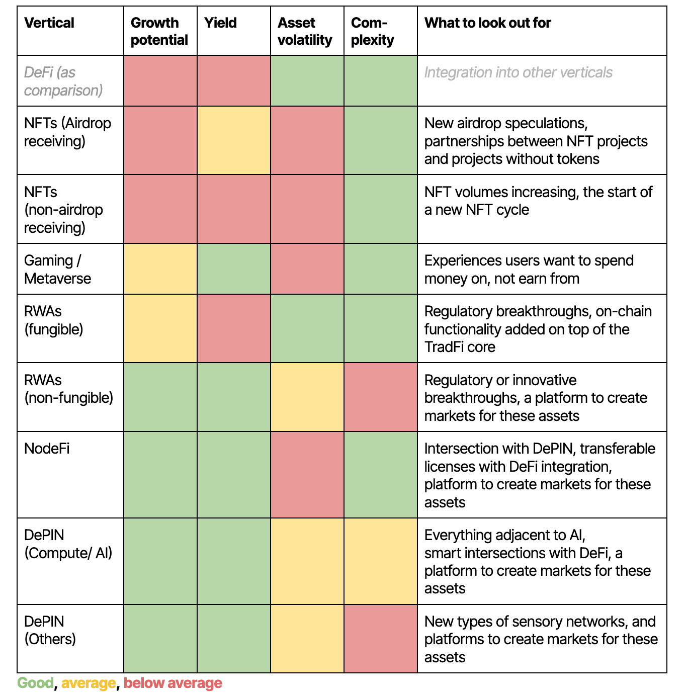 - Yield potential: Assesses the yield potential of the vertical, excluding additional token incentives.