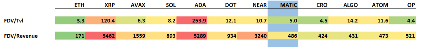 MATIC (the tokens are used to govern and secure the Polygon network and pay transaction fees), currently trades on ~480x P/S. This is roughly in line with the rest of the L1 space but compares to ~170x for Ethereum. However, MATIC looks much more attractive on an FDV/ TVL basis as below.