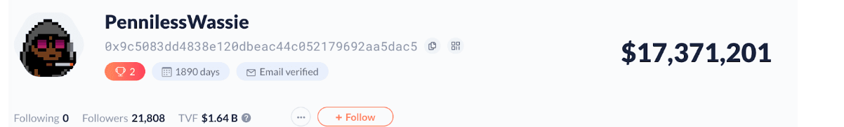 Wallet Size: $21.6mm Debank Followers: 23k Smart Money on Nansen? No